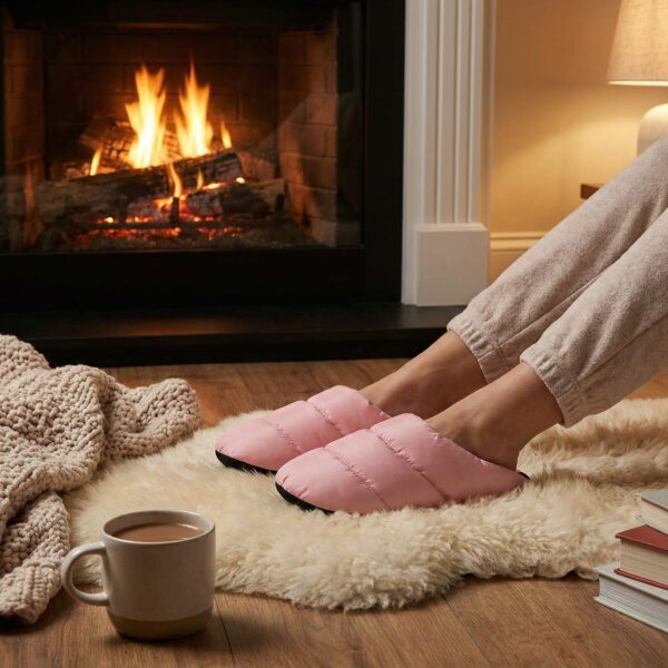 Introducing our versatile indoor slippers—crafted to blend ultimate comfort with practical design for every moment of your day. Made with a durable, smooth nylon shell and filled with plush faux down, these slippers wrap your feet in a cloud-like softness that feels like a warm hug. The flat heel and silent non-slip sole let you move quietly across floors, making them perfect for early mornings at home or quiet office environments where noise is a no-go.