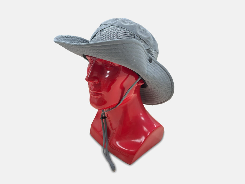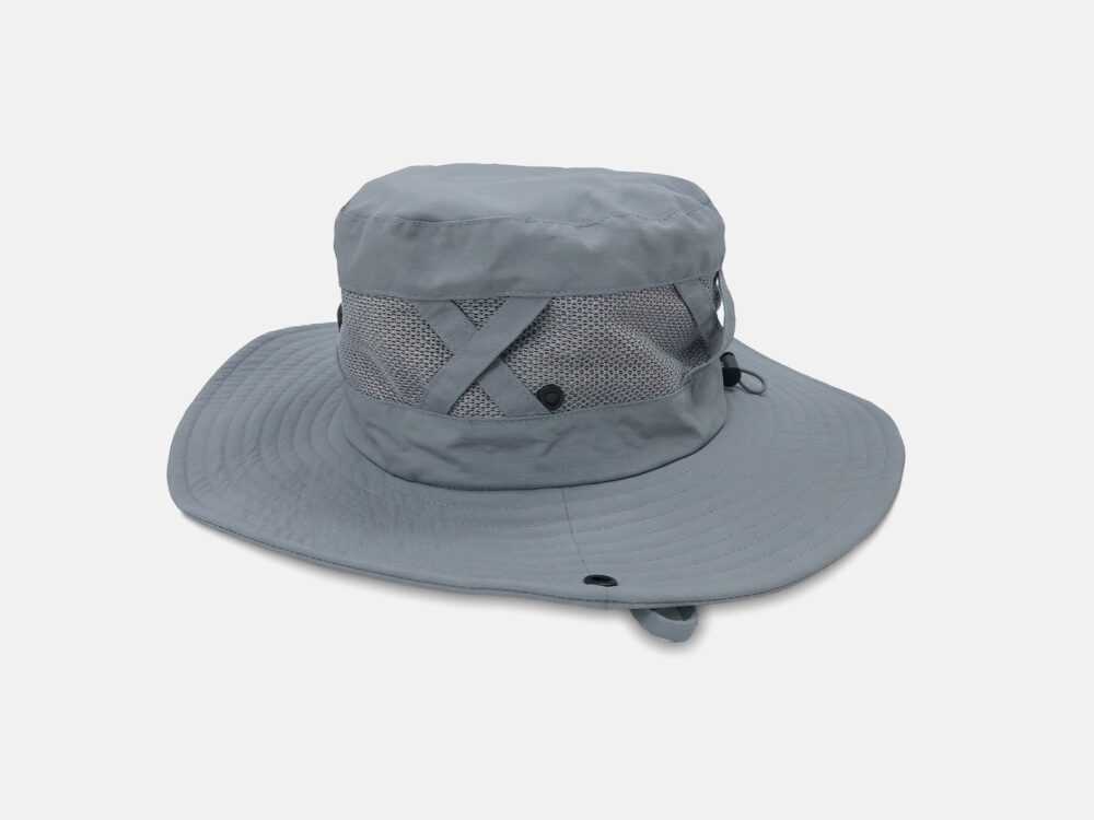 100% nylon taslon sun hat with a wide brim for UV protection. Breathable mesh panels and cross straps boost ventilation, while an adjustable drawcord ensures a secure fit. Perfect for hiking, fishing, or camping.