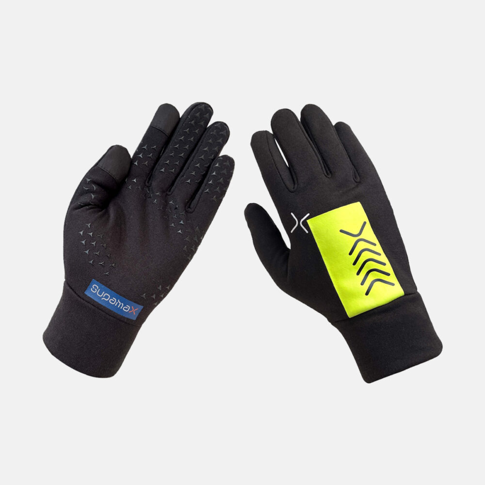 Designed for running and cycling, these gloves are made of stretchy spandex. They feature touchscreen – compatible fingertips, grippy dots on palms for a secure hold, and a snug fit. A bright neon panel and brand logo add style, merging functionality with comfort.
